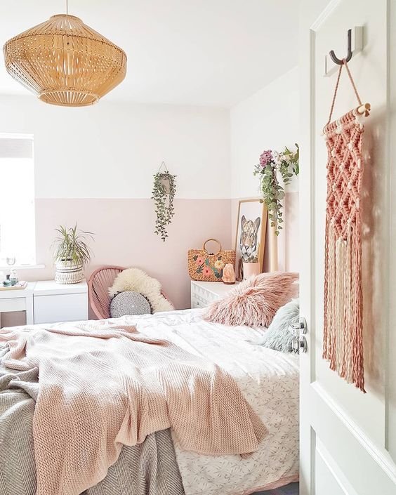 Not all boho bedroom decoration needs to be loud to stand out. A smooth and gentle pastel color palette can feel lively while it is matched with dramatic mountain climbing wallpaper and a problematic rattan bed. He layers textiles (velvety throws, plump cushions, an ambitious patterned rug) for heat and visual intensity, and adds a statement chandelier for elegance and intrigue.